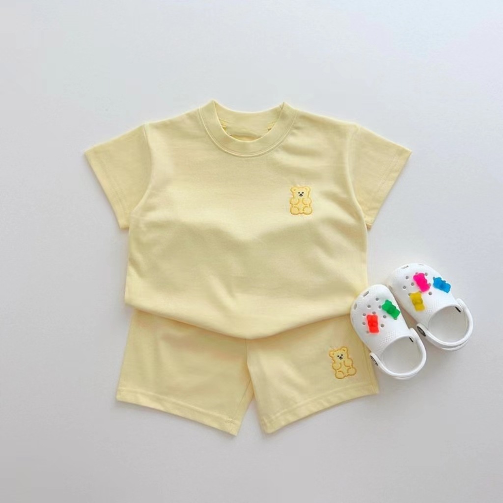 Dieses zweiteilige Set aus kurzärmeligem T-Shirt und Shorts ist die ideale Wahl für den Sommer. Mit seinem niedlichen, bestickten Teddybär-Design und dem lässigen koreanischen Stil verbindet es Komfort und Mode – perfekt für aktive Kinder.